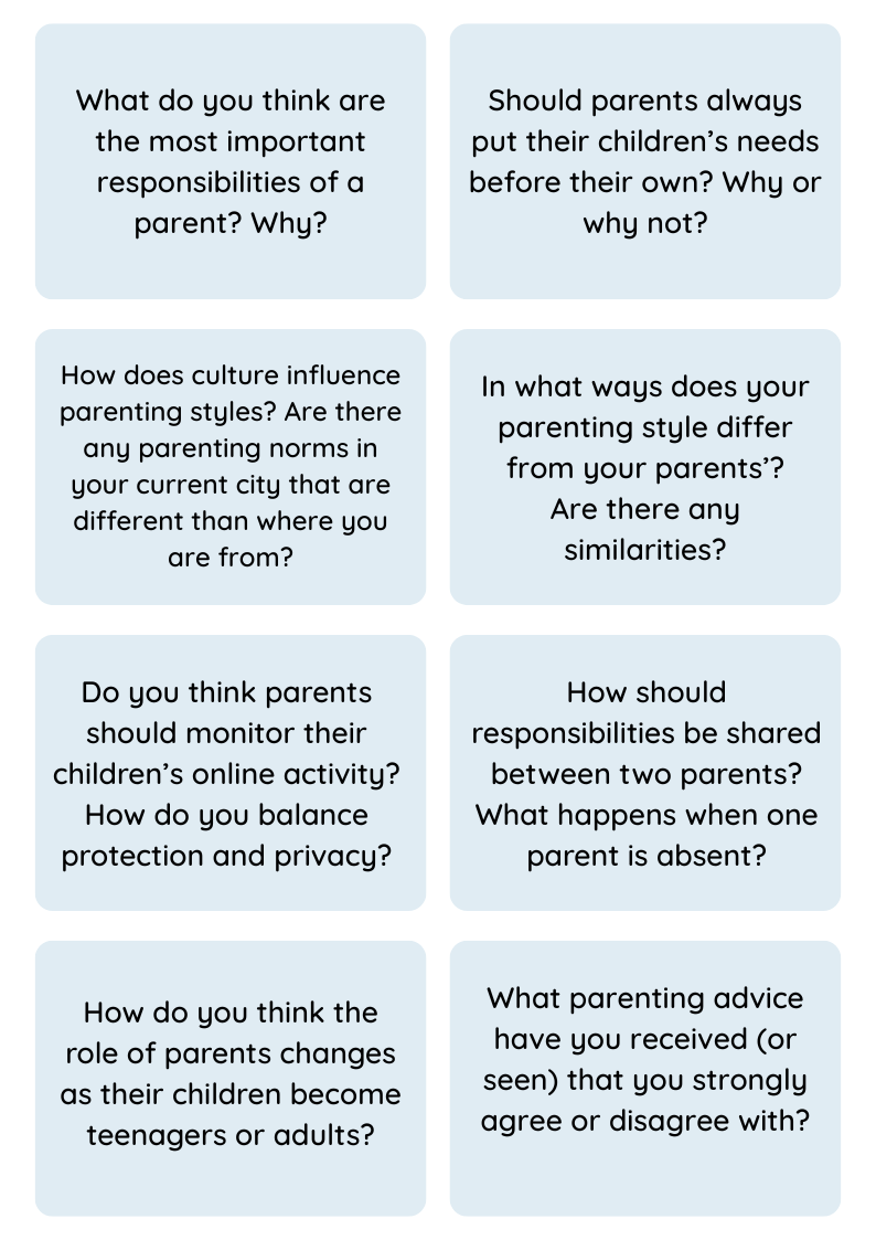 With a partner, use the conversation cards to talk about parenting topics and how you spend time with your family or children.